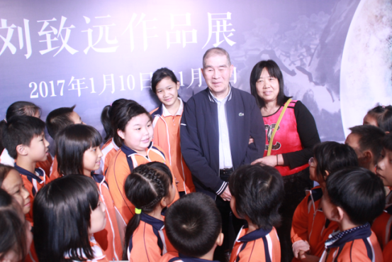展覽現(xiàn)場,高勵節(jié)與以其父親名字命名的“劍父小學”學生們合影