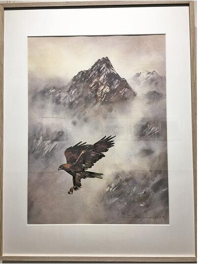 雄鷹展翅翱翔、盤旋于海灣、高山的上空,這是蔣燁教授水彩畫中的場景。概括凝練的風(fēng)景,氣度非凡的飛鷹,一動一靜間把融合中國傳統(tǒng)文化的現(xiàn)代水彩語境表現(xiàn)得酣暢淋漓。開幕當(dāng)天,蔣燁將畫作《?!棥焚浰徒o了龍崗區(qū)人民政府。