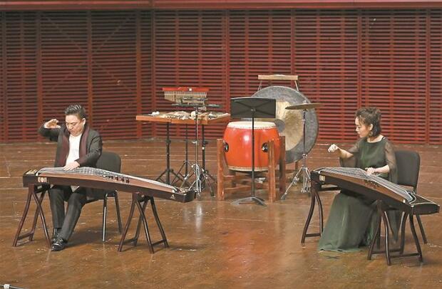 葉小綱創(chuàng)作的古箏獨奏曲《林泉》,可謂清新脫俗,奔涌跌宕,用多種創(chuàng)作手段和高難的演奏技法,將自然界晦明更迭、晴雨接踵、清泉潺潺、惡風(fēng)獵獵的生動景象加以細(xì)致描摹,給古箏的藝術(shù)表現(xiàn)帶來更多的可能性。宋心馨功底好,善表演,表現(xiàn)出人琴合一、情音互融的美好意象。筆者這一代愛樂者大都聽過劉文金的二胡名曲《豫北敘事曲》,此次演奏的是這位民樂大師生前創(chuàng)作的無伴奏二胡二重奏《火·彩衣姑娘》。劉老此曲一改長期延用的傳統(tǒng)路線而風(fēng)格大變,透露其晚年依然旺盛的創(chuàng)新活力。宋飛師徒身著紫、青兩色連衣裙玉立演奏,“風(fēng)吹仙袂飄飄舉”,細(xì)膩呈現(xiàn)出此曲熱烈、浪漫、溫柔、含蓄的豐富層次,從作品到臺容都給人全新的藝術(shù)感受。