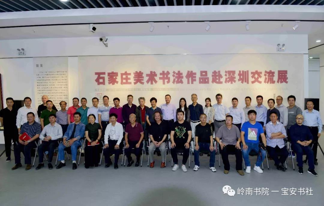 石家莊市與深圳市美術(shù)書法界的藝術(shù)家與參加開幕式的領(lǐng)導(dǎo)和嘉賓合影,石家莊美術(shù)書法作品赴深圳交流展成功開幕。