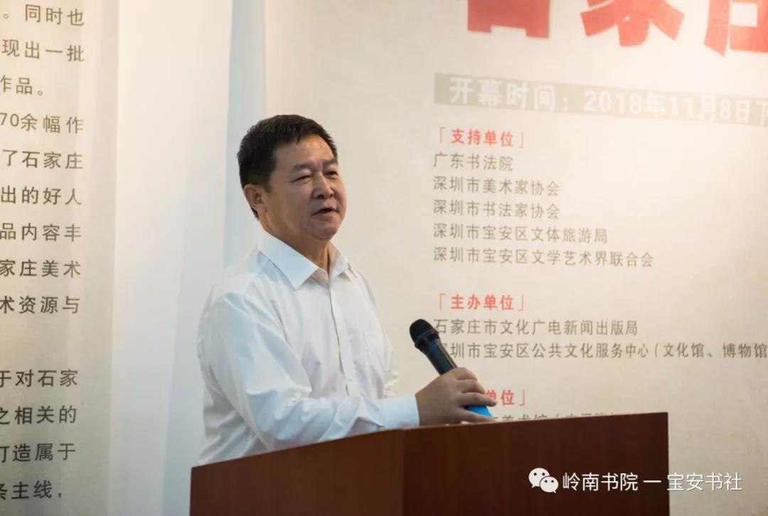 2018年11月8日下午15:00,由石家莊市文化廣電新聞出版局、深圳市寶安區(qū)公共文化服務(wù)中心(文化館、博物館、美術(shù)館)主辦,石家莊市美術(shù)館(市畫院)、嶺南書院、深圳寶安書法藝術(shù)研究社承辦,深圳市寶安區(qū)圖書館、寶安區(qū)美協(xié)、寶安區(qū)書協(xié)協(xié)辦并得到深圳市書法家協(xié)會、美術(shù)家協(xié)會、寶安區(qū)文體旅游局、寶安區(qū)文聯(lián)的大力支的 “ 石家莊美術(shù)書法作品赴深圳交流展 ” 在深圳市寶安區(qū)圖書館負一樓展廳隆重開幕——