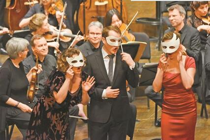 經(jīng)過(guò)對(duì)歌劇《唐璜》的嚴(yán)謹(jǐn)考證,勒內(nèi)·雅各布斯以鮮活的“古樂”形式還原了早期古典主義歌劇的音樂特質(zhì)。據(jù)凱撒介紹,昨晚的演出與以往歌劇表演有很大不同。音樂會(huì)版的歌劇《唐璜》中,樂團(tuán)、指揮、獨(dú)唱與合唱團(tuán)都在舞臺(tái)上,演員不僅會(huì)在臺(tái)前演唱,還穿梭在樂團(tuán)中,帶來(lái)生動(dòng)的演出。