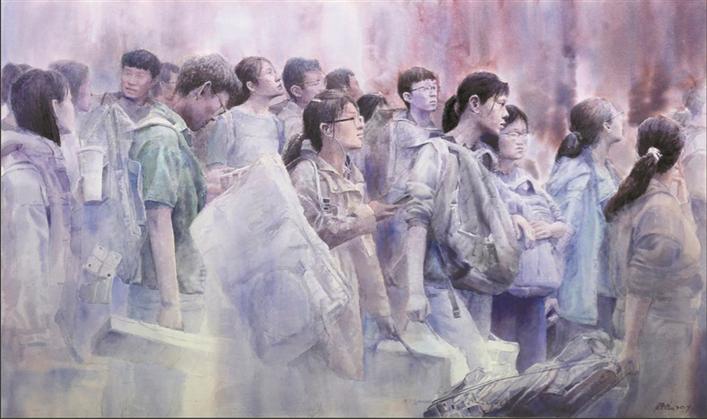 藝術家方曉龍此次有兩件作品入選,分別是水彩畫《追夢》和與青年藝術家張凱合作的油畫《掠過晨曦的夢想》。兩幅作品聚焦同一主題——青年學子參加藝考,這來自他對這一題材長年累月的觀察。
