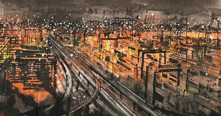 楊曉洋創(chuàng)作的《東方巨港——璀璨鹽田》是此次入選的國畫作品之一。作品以深圳港夜色為主題,體現(xiàn)了中國改革開放前沿城市深圳滄海桑田的巨變和這座城市的繁榮景象。同樣是表現(xiàn)現(xiàn)代題材的城市景觀,從楊曉洋的作品中就可看出以對版畫的黑白對比手法、平面構成的象征形式、夜景特色的表現(xiàn)手法的出色運用等方式來表達出作者對都市景觀的趣味。