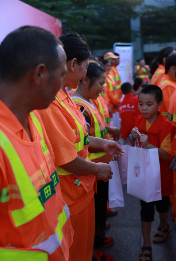 活動現(xiàn)場,深圳市關愛辦、中國銀行深圳分行代表主辦方還向現(xiàn)場30余位環(huán)衛(wèi)工人贈送了早餐、餐券及工作馬甲等物資。