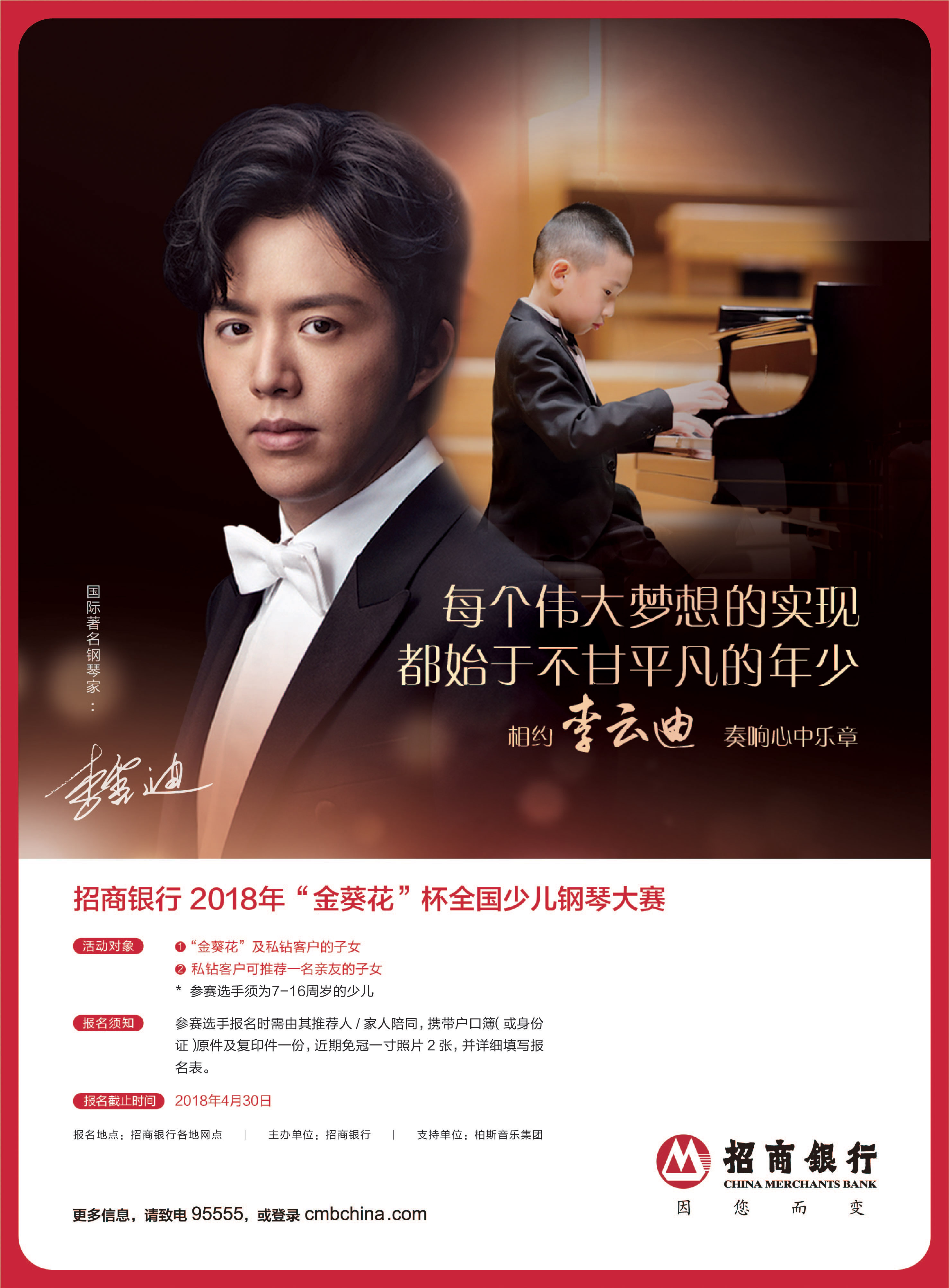 據(jù)大賽組委會(huì)介紹,本屆大賽主辦單位為招商銀行,支持單位為柏斯音樂集團(tuán)。報(bào)名時(shí)間截止至4月30日,初賽將在5月進(jìn)行,7月下旬舉行總決賽。招商銀行“金葵花”客戶、私鉆客戶7至16周歲的子女均可報(bào)名參賽。此外,私鉆客戶還擁有額外推薦一名選手參賽的權(quán)益。