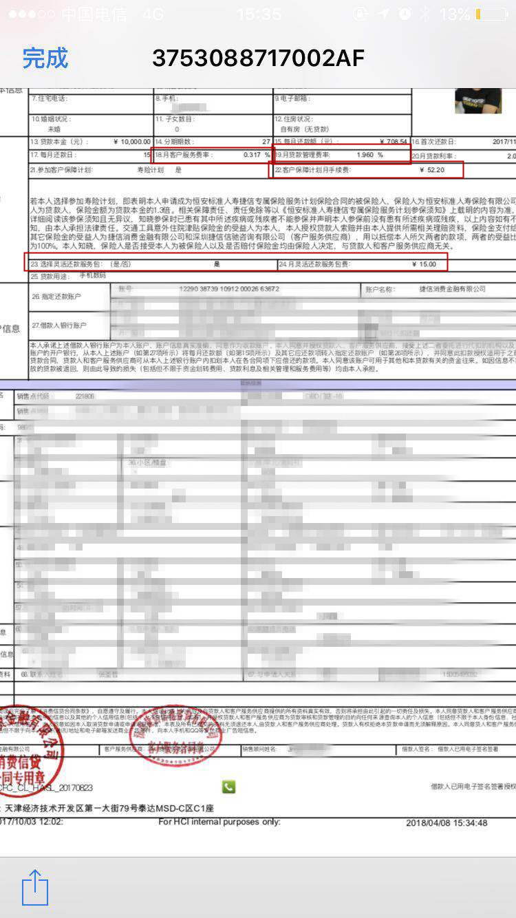 “整個貸款過程我都沒有和他們簽署任何紙質合同,也沒見過合同,后來我投訴給他們,他們才提醒我捷信AAP里有合同,那份合同的資料、照片、簽名都是復制我購買手機時第一次簽署的合同。要是早給我看合同,我絕對不會貸款的?!焙蜗壬嬖V記者。