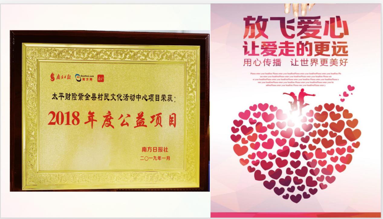 太平財產(chǎn)保險有限公司深圳分公司于2017年捐助紫金縣竹塘村村民文化中心工程,獲得了公益項目獎。太平財險負責人表示,在集團“共享太平”的旗幟下,深圳分公司將繼續(xù)服務實體經(jīng)濟,關(guān)注公益活動,助力鄉(xiāng)村振興,有力落實央企責任。