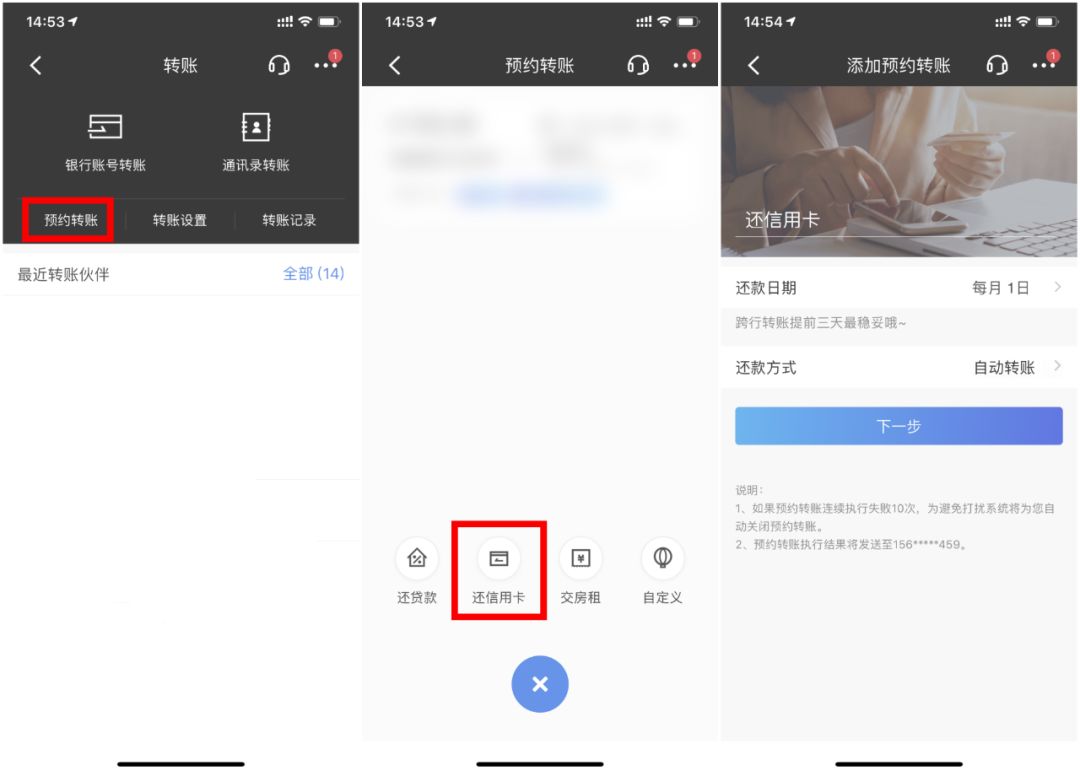 在轉賬頁面點擊“預約轉賬”,選擇“還信用卡”。根據(jù)提示選擇日期、方式等,每月即可收到還款提醒,媽媽再也不用擔心我的信用卡逾期了!