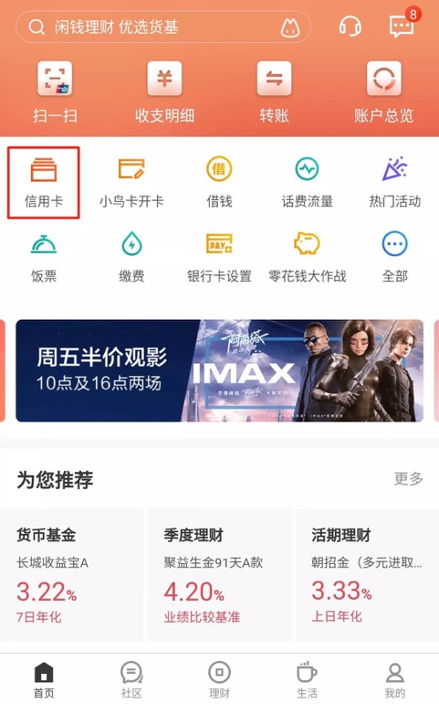 打開招商銀行App,在首頁點擊“信用卡”進入信用卡界面,點擊“還款”根據(jù)提示即可在線還款。