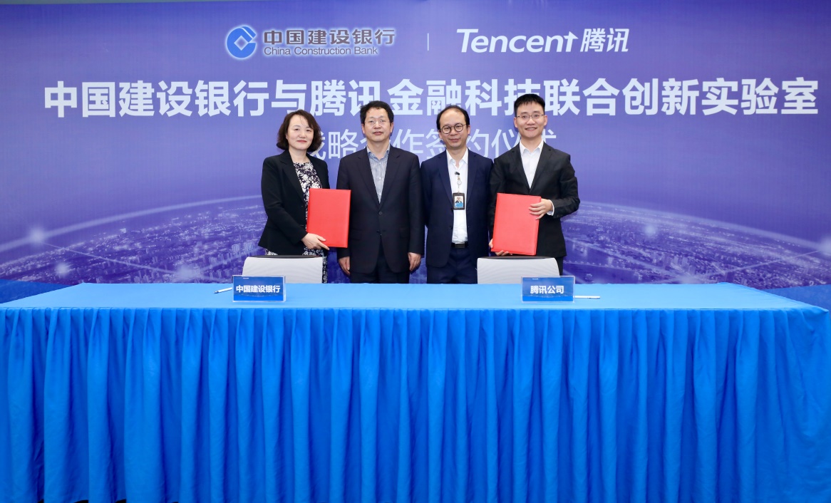 建設(shè)銀行副行長張立林、騰訊集團副總裁鄭潤明見證,建設(shè)銀行金融科技部總經(jīng)理朱玉紅、騰訊云副總裁王慧星代表雙方簽約