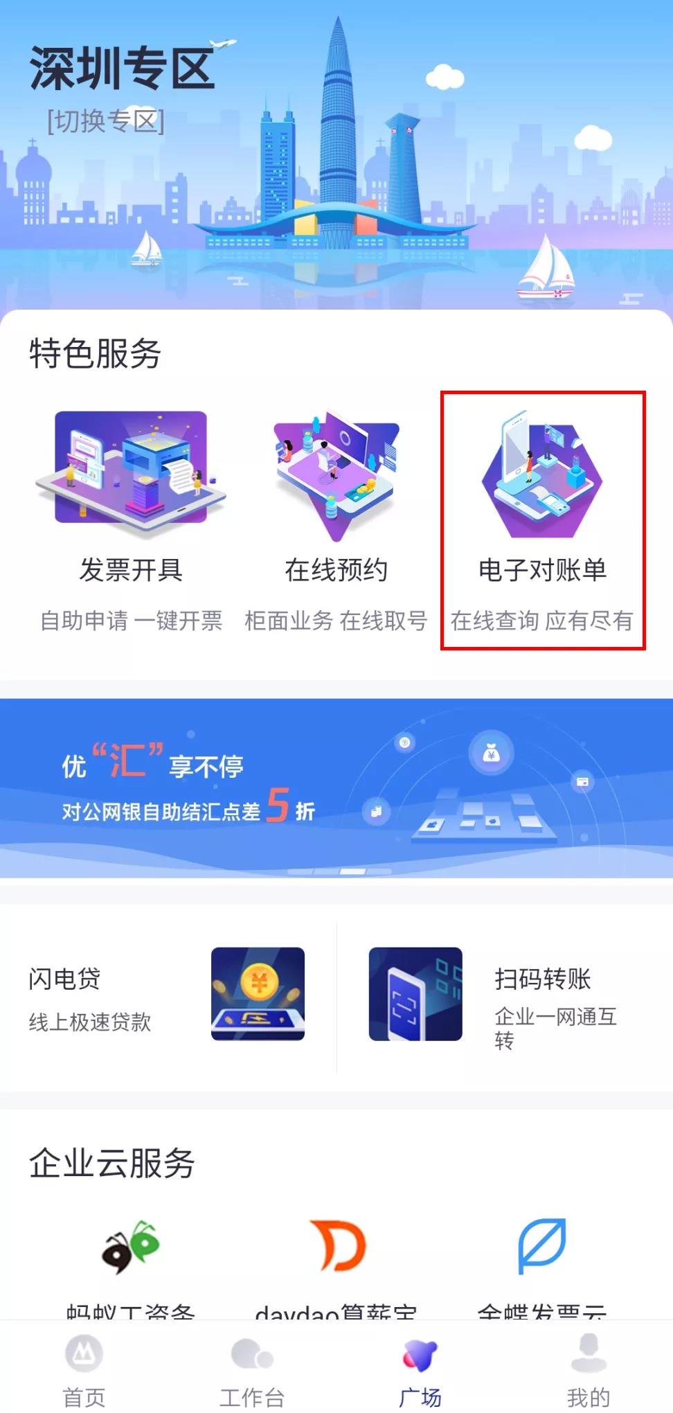 打開招商銀行企業(yè)App,點擊“廣場”板塊,找到深圳專區(qū)。