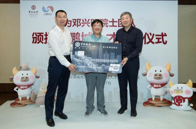 深圳新聞網(wǎng)·見圳客戶端2020年11月8日訊 昨日,深圳市光明區(qū)委常委、組織部部長繩萬青,中國銀行深圳市分行副行長韓竹代表深圳市光明區(qū)人才辦和中國銀行深圳市分行,為生物學(xué)家、美國國家科學(xué)院院士鄧興旺及部分團(tuán)隊(duì)成員頒發(fā)了“中銀鵬城人才卡”鉆石卡,這是全市范圍內(nèi)首張向在深院士發(fā)放的“中銀鵬城人才卡”,標(biāo)志著這張由光明區(qū)人才辦和深圳中行共同策劃推出的人才卡實(shí)現(xiàn)了市級認(rèn)定的各層級人才全覆蓋。鄧興旺院士是深圳市杰出人才獲得者、深圳市作物分子設(shè)計(jì)育種研究院院長、深圳興旺生物種業(yè)有限公司董事長,他帶領(lǐng)團(tuán)隊(duì)2010年到深圳創(chuàng)業(yè),多年來在水稻領(lǐng)域取得兩項(xiàng)重大技術(shù)突破,其中“潔田模式”大規(guī)模市場示范面積達(dá)到50萬畝,有效加快了中國農(nóng)業(yè)的輕簡化、現(xiàn)代化步伐。