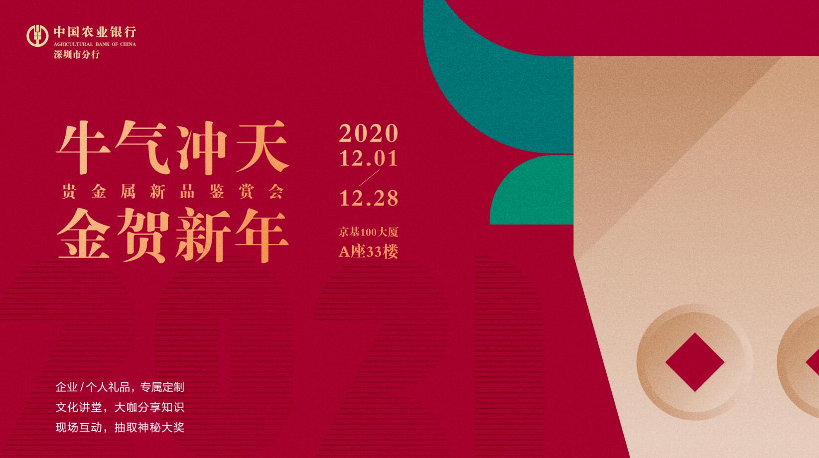 深圳新聞網·見圳客戶端2020年12月1日訊 為滿足客戶的多元化贈禮、收藏、投資需求,為客戶提供個性化定制服務,2020年12月1日至28日,深圳農行在京基100大廈A座33樓舉辦“牛氣沖天·金賀新年”貴金屬新品鑒賞會。