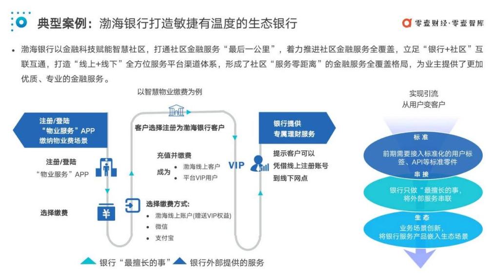 以此次該行入圍行業(yè)權(quán)威報(bào)告的“智慧物業(yè)”金融科技創(chuàng)新服務(wù)項(xiàng)目為例,渤海銀行創(chuàng)新業(yè)務(wù)場景——繳納物業(yè)費(fèi)場景,社區(qū)居民通過“物業(yè)服務(wù)APP”繳納物業(yè)費(fèi)時(shí),可以選擇渤海銀行線上賬戶為付費(fèi)方式,當(dāng)用戶充值并繳費(fèi)后,便同時(shí)成為了渤海銀行線上客戶和平臺(tái)V IP,并享受銀行提供的專屬理財(cái)服務(wù)。通過將自身服務(wù)產(chǎn)品嵌入“物業(yè)服務(wù)”A PP,只做“最擅長的事,渤海銀行將外部服務(wù)串聯(lián)”,最終實(shí)現(xiàn)A PP用戶到自身客戶的轉(zhuǎn)變。