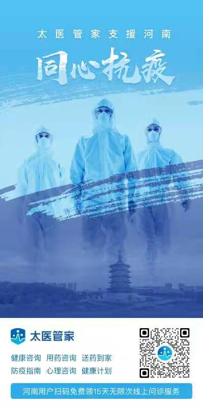 近日,河南地區(qū)出現(xiàn)多起疫情病例,為支援抗疫工作,幫助當(dāng)?shù)鼐用褡龊媒】倒芾?,增?qiáng)抗疫信心,太?;ヂ?lián)網(wǎng)醫(yī)院——太醫(yī)管家繼向西安市民開放免費(fèi)線上問診通道后,再次定向河南地區(qū)居民推出在線問診服務(wù)。