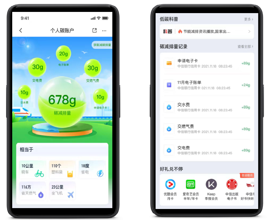 “中信碳賬戶”減碳量核算采用第三方權(quán)威機(jī)構(gòu)認(rèn)定的碳減排方法學(xué),經(jīng)上海環(huán)境能源交易所組織專家評審認(rèn)定,保證了核算的科學(xué)性和權(quán)威性,對于綠色出行、綠色消費、綠色生活等節(jié)能減排場景,用戶可實時記錄與查詢個人的碳減排數(shù)據(jù)。“中信碳賬戶”旨在成為消費者低碳生活方式的掌上動態(tài)指南,倡導(dǎo)綠色低碳生活方式成為當(dāng)今的生活新風(fēng)尚。