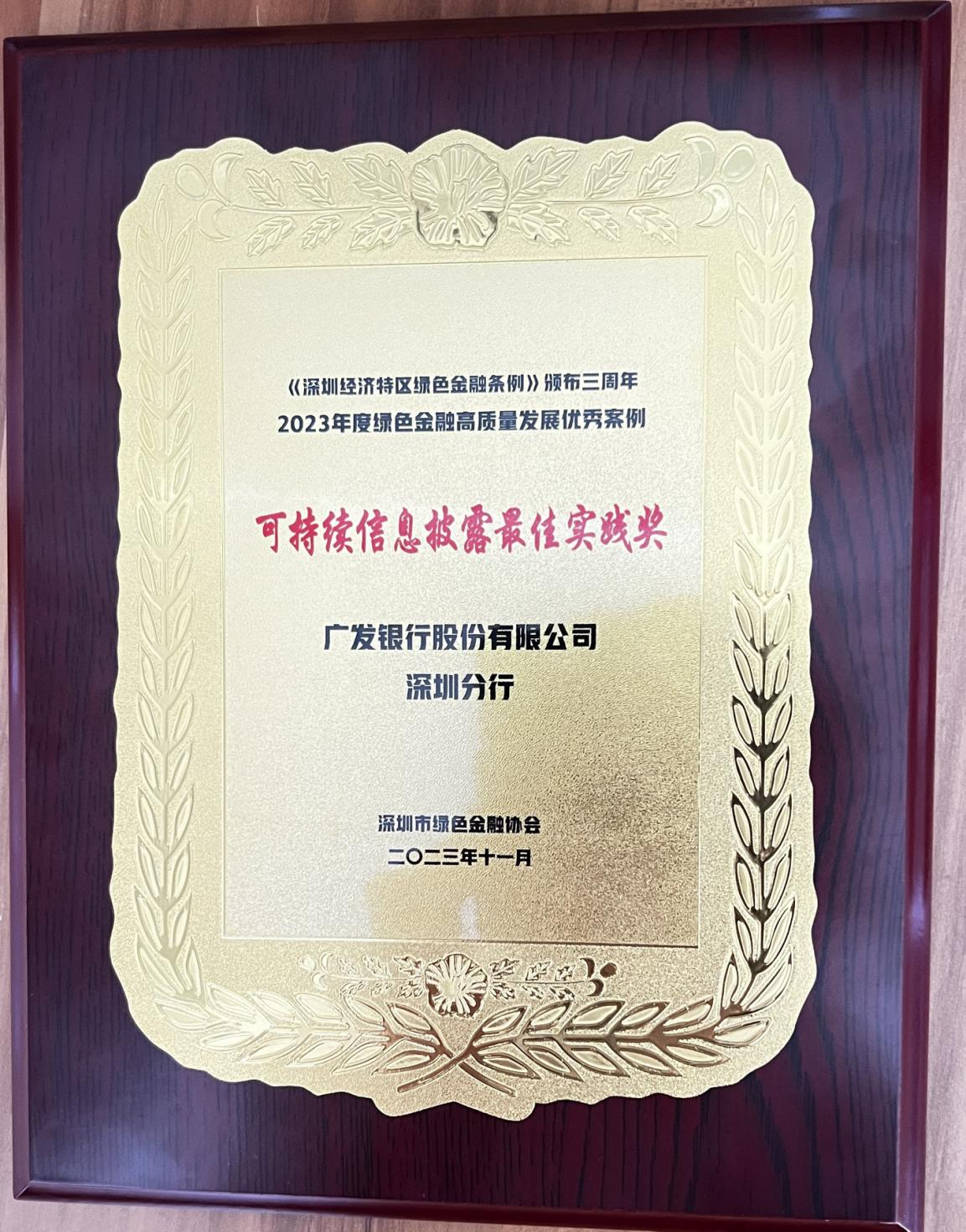 深圳新聞網(wǎng)2023年11月30日訊(記者 朱琳 通訊員 李華鳳)近日,深圳市綠色金融協(xié)會組織開展“2023年綠色金融高質(zhì)量發(fā)展優(yōu)秀案例評選”活動,表彰貫徹落實(shí)《深圳經(jīng)濟(jì)特區(qū)綠色金融條例》、推動綠色金融發(fā)展的最佳實(shí)踐,以榜樣力量引領(lǐng)綠色金融高質(zhì)量發(fā)展的典型。廣發(fā)銀行深圳分行榮獲“可持續(xù)信息披露最佳實(shí)踐獎”。