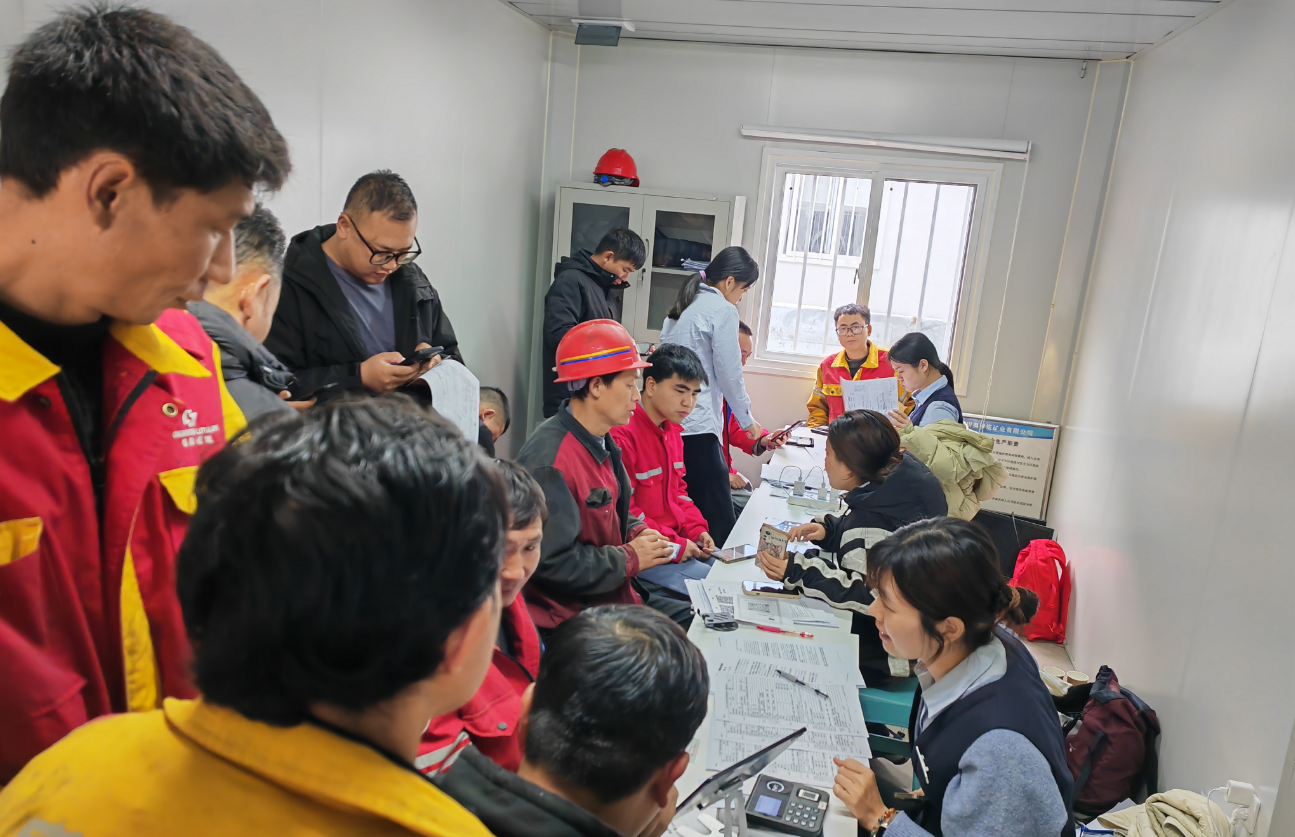面對困難,陳嘉濤深知客戶需求無小事。他果斷決定帶隊前往現(xiàn)場,為當?shù)貑T工集中辦理銀行卡開卡及工資代發(fā)相關(guān)手續(xù)。從繁華的深圳到偏遠的高原,路途遙遠、舟車勞頓,加上高原反應(yīng)帶來的身體不適,讓整個團隊面臨嚴峻考驗。但他們沒有絲毫退縮,抵達后便迅速搭建臨時服務(wù)點,投入到緊張的工作中。