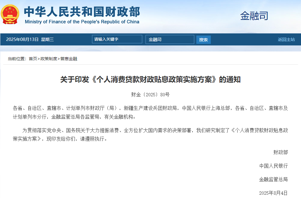 深圳新聞網(wǎng)2025年8月13日訊(記者 湯莎)近日,財(cái)政部、中國(guó)人民銀行、金融監(jiān)管總局印發(fā)《個(gè)人消費(fèi)貸款財(cái)政貼息政策實(shí)施方案》(以下簡(jiǎn)稱(chēng)方案),中央及省級(jí)財(cái)政將對(duì)符合條件的個(gè)人消費(fèi)貸款實(shí)施貼息。