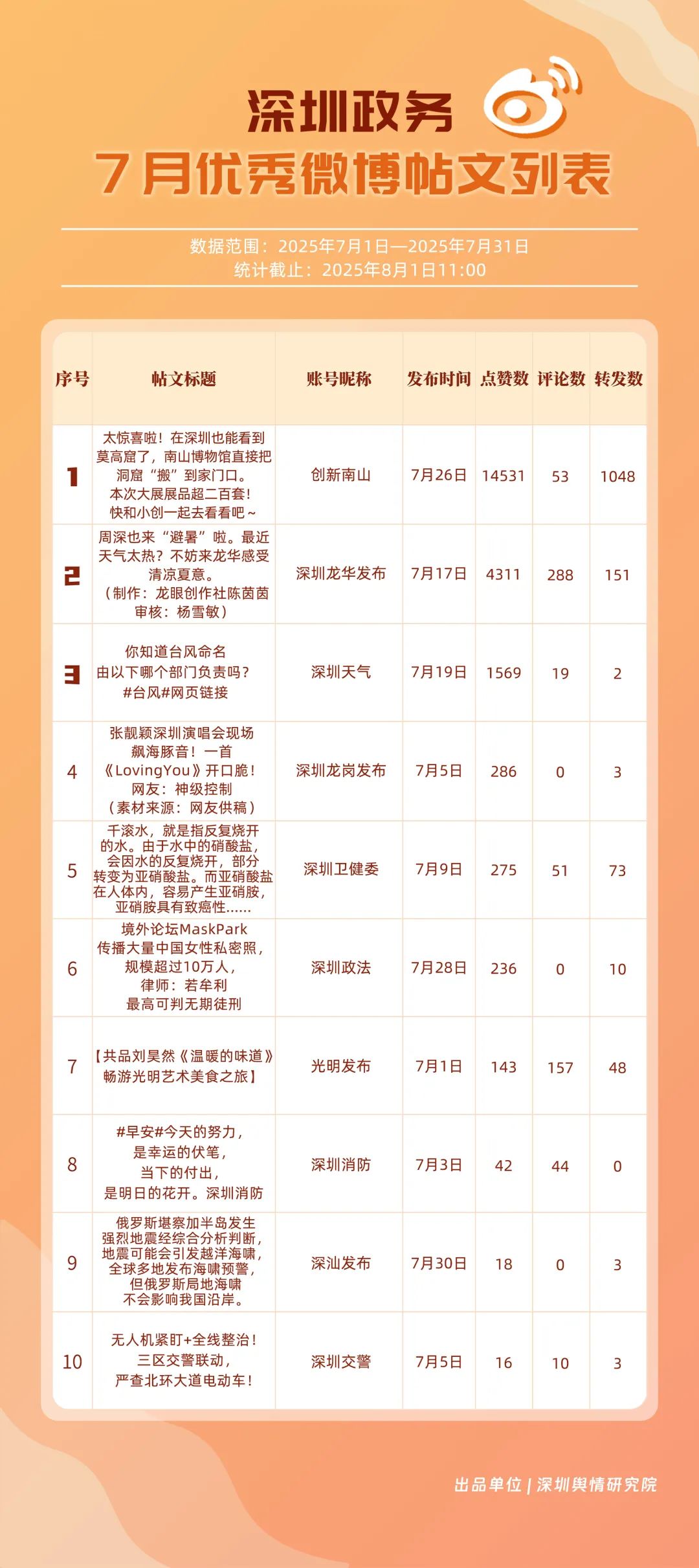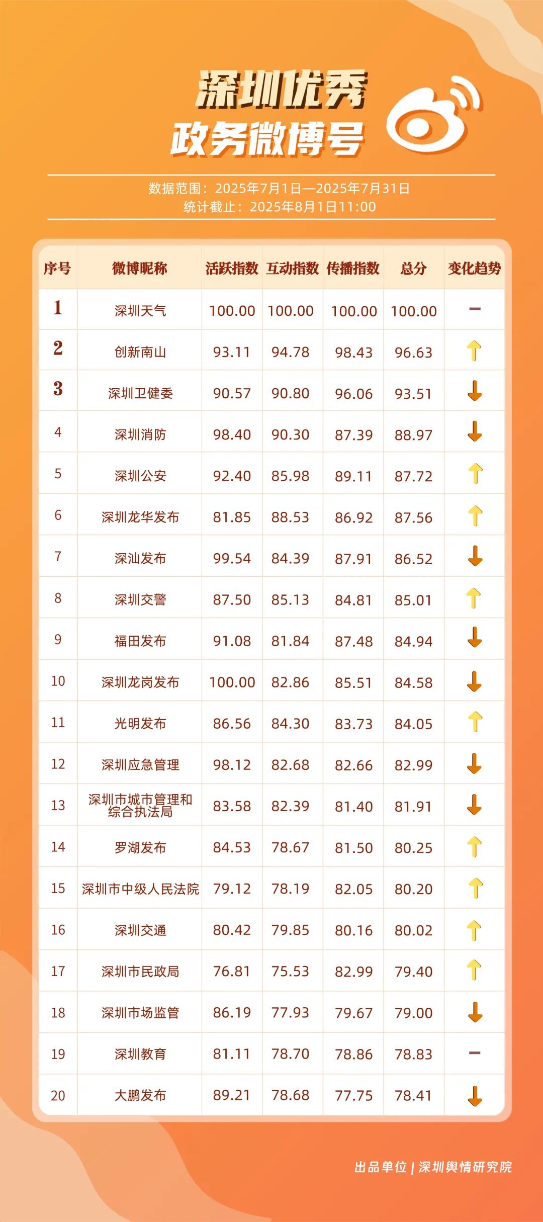 7月,“深圳天氣”“創(chuàng)新南山”“深圳衛(wèi)健委”“深圳消防”“深圳公安”“深圳龍華發(fā)布”“深汕發(fā)布”“深圳交警”“福田發(fā)布”“深圳龍崗發(fā)布”等20個賬號入選“優(yōu)秀政務(wù)微博號”。其中,“深圳天氣”以活躍、互動、傳播指數(shù)三項滿分,蟬聯(lián)榜首;“創(chuàng)新南山”以總分96.63躍居第二,排名呈上升趨勢;“深圳衛(wèi)健委”位列第三,評分也在90分以上,其科普信息持續(xù)獲得市民廣泛認(rèn)可。以上優(yōu)秀的政務(wù)微博賬號精準(zhǔn)貼合平臺的傳播規(guī)律,用獨特的賬號風(fēng)格展現(xiàn)各自特色與魅力。