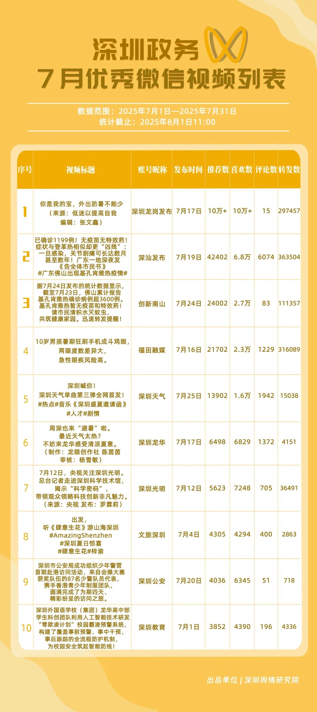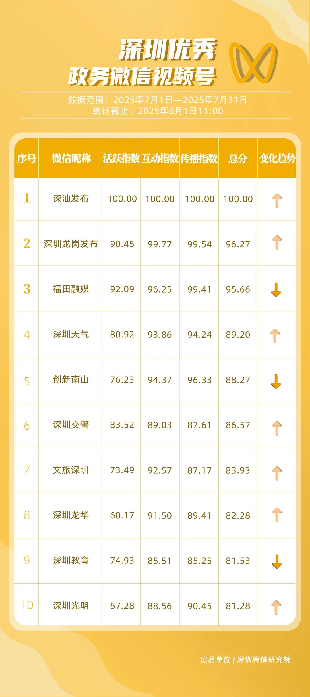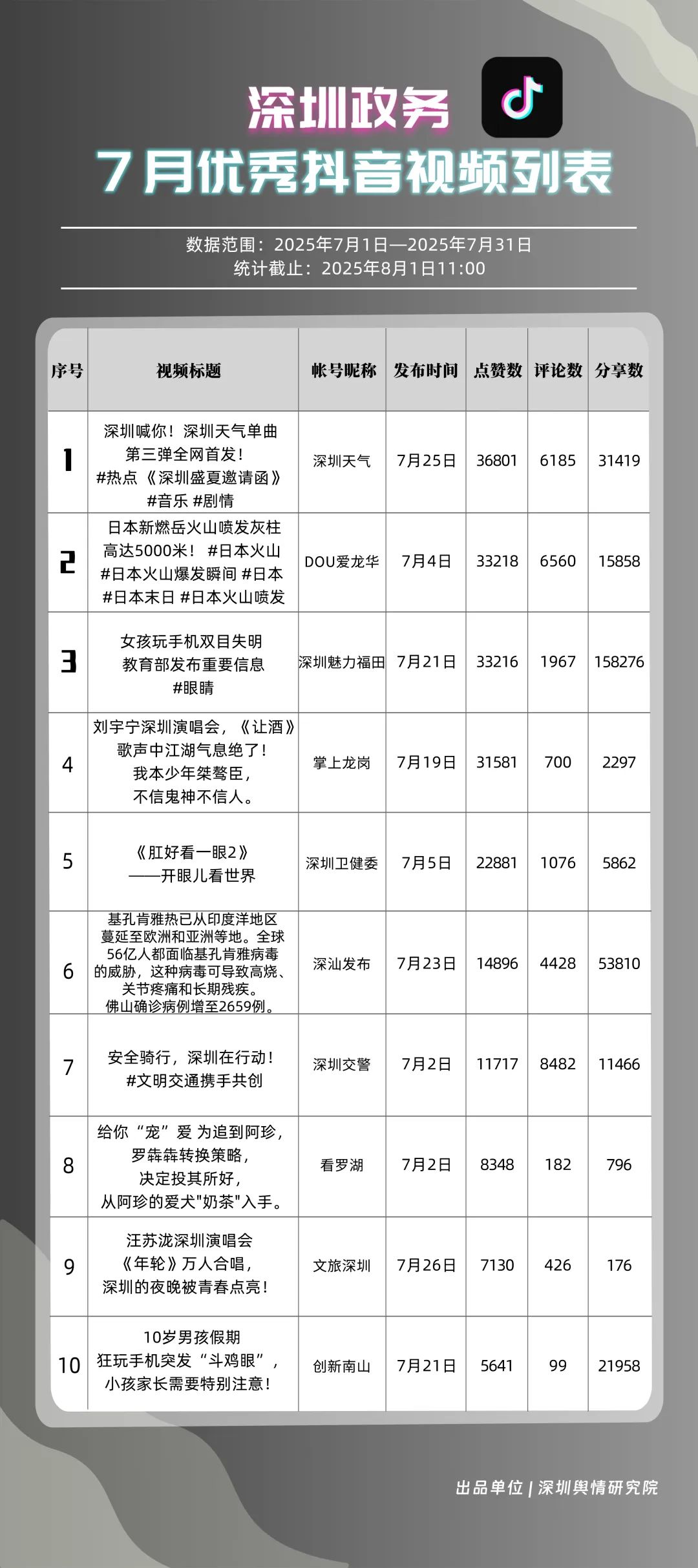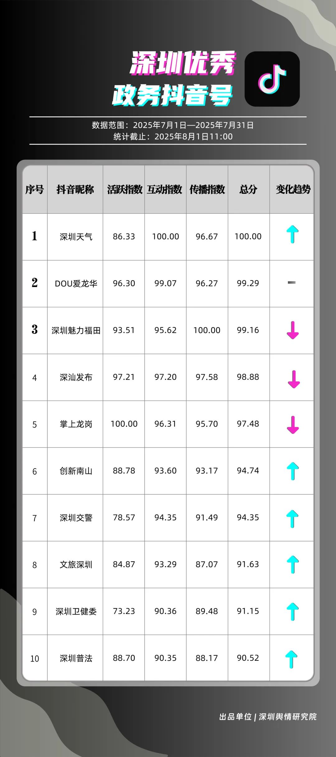 7月,“深圳天氣”“DOU愛龍華”“深圳魅力福田”“深汕發(fā)布”“掌上龍崗”“創(chuàng)新南山”“深圳交警”“文旅深圳”“深圳衛(wèi)健委”“深圳普法”共10個政務(wù)抖音號獲得“優(yōu)秀政務(wù)抖音號”稱號。其中,“深圳天氣”互動指標(biāo)獲滿分,憑借氣象與趣味相結(jié)合的創(chuàng)新科普形式,領(lǐng)跑優(yōu)秀政務(wù)抖音號;“DOU愛龍華”“深圳魅力福田”分別位列第二、三名,通過聚焦網(wǎng)絡(luò)熱點、挖掘創(chuàng)意內(nèi)容,不斷提升傳播效能,展現(xiàn)出強大的政務(wù)新媒體影響力;“深汕發(fā)布”“掌上龍崗”“創(chuàng)新南山”等賬號緊隨其后,上榜的優(yōu)質(zhì)政務(wù)抖音號用短視頻語言強化傳播效果,展現(xiàn)了鮮明的賬號特色和風(fēng)采。