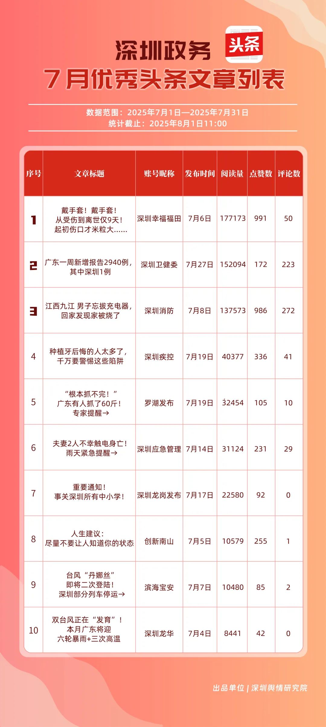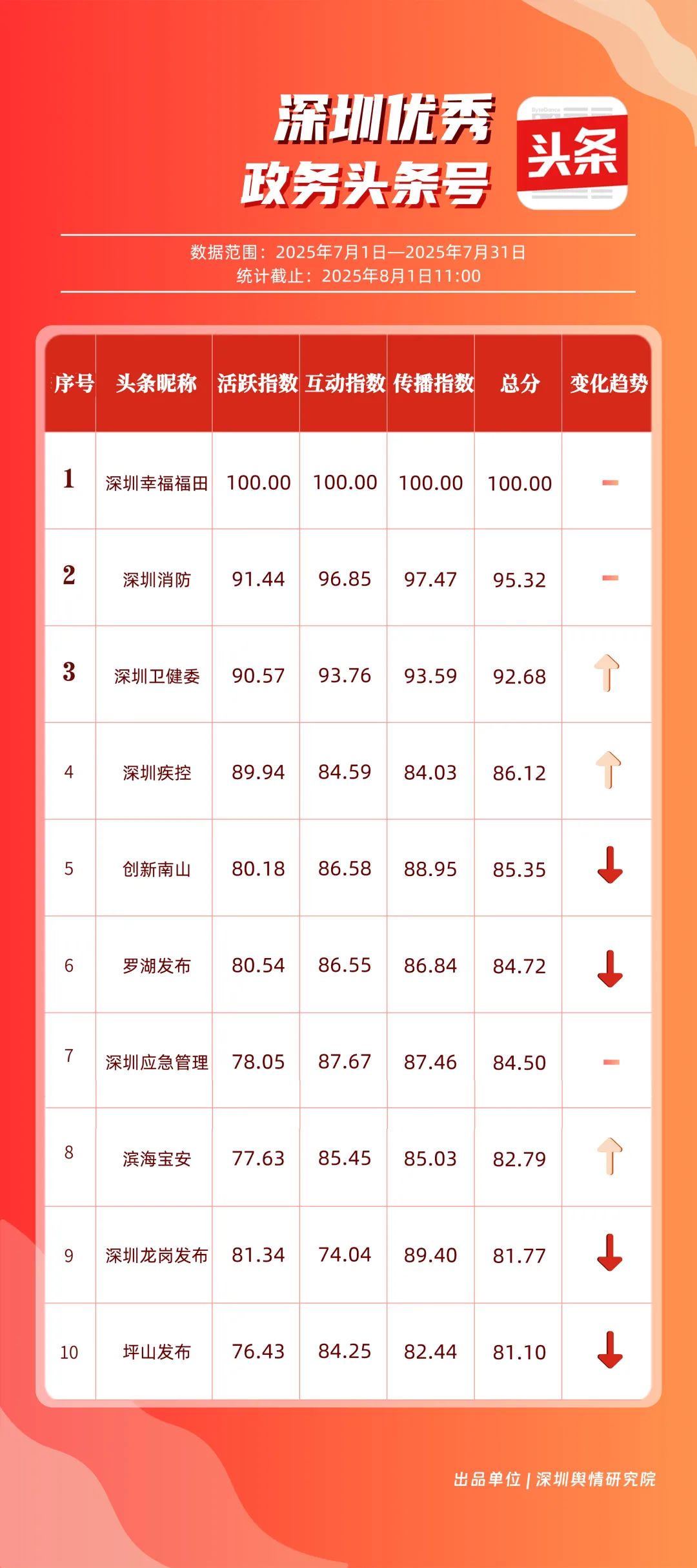 7月,“深圳幸福福田”“深圳消防”“深圳衛(wèi)健委”“深圳疾控”“創(chuàng)新南山”“羅湖發(fā)布”“深圳應(yīng)急管理”“濱海寶安”“深圳龍崗發(fā)布”“坪山發(fā)布”共10個政務(wù)頭條號入選“優(yōu)秀政務(wù)頭條號”榜單?!吧钲谛腋8L铩薄吧钲谙馈睉{借優(yōu)質(zhì)內(nèi)容持續(xù)吸引用戶關(guān)注,穩(wěn)居前二;“深圳衛(wèi)健委”表現(xiàn)亮眼,評分達(dá)92.68分,排名較6月有所上升;“深圳疾控”同樣進步明顯,在疾病預(yù)防控制信息傳播上發(fā)揮了重要作用?!皠?chuàng)新南山”“羅湖發(fā)布”“深圳應(yīng)急管理”等上榜賬號,也各展所長,始終將優(yōu)質(zhì)內(nèi)容作為核心抓手,成為政務(wù)新媒體領(lǐng)域內(nèi)容創(chuàng)作與傳播的典范。