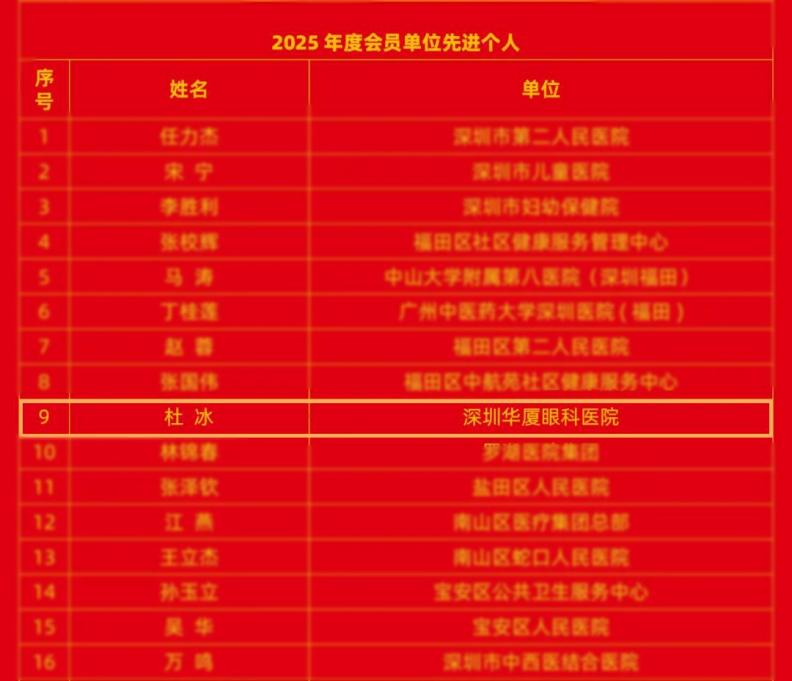 深圳新聞網2026年1月29日訊(記者 林恒鑫)1月27日,深圳市社區(qū)衛(wèi)生協會公布了2025年度優(yōu)秀分支機構及先進個人名單,深圳華廈眼科醫(yī)院副院長杜冰教授因在社康眼健康服務中的突出表現,榮獲“2025年度會員單位先進個人”稱號。