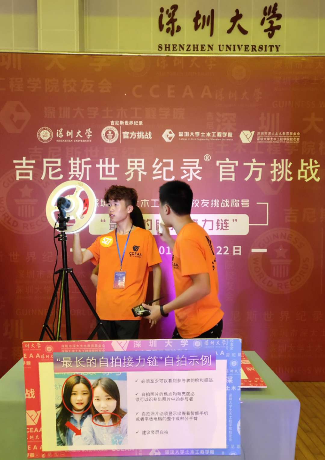 深圳新聞網(wǎng)訊 9月22日下午3點,深圳大學土木工程學院千名師生、校友齊聚深圳大學元平體育館,成功創(chuàng)造“最長的自拍鏈條”吉尼斯世界紀錄 TM 稱號。