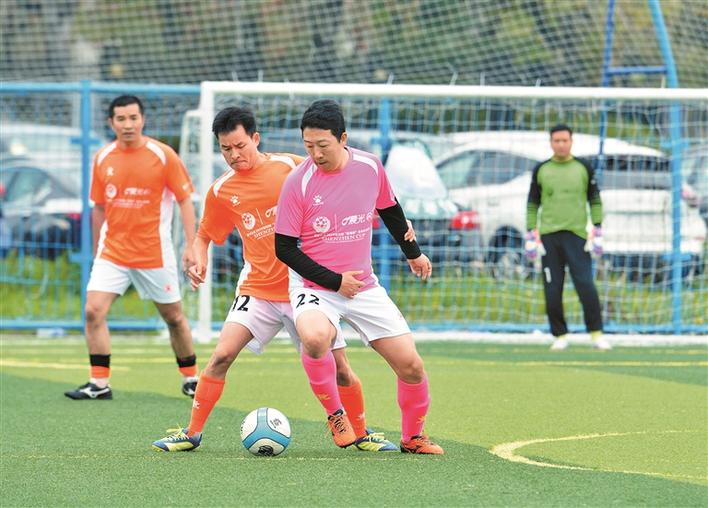 ▲“深圳杯”媒體賽,深圳特晚聯(lián)隊球員(右一)積極拼搶。