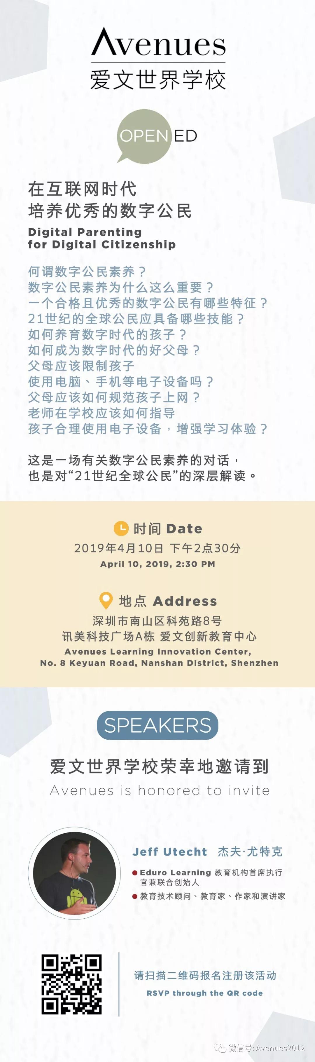 愛文世界學(xué)校專門邀請了知名的教育技術(shù)顧問、教育家、作家及演講家杰夫?尤特克 (Jeff Utecht),就數(shù)字公民素養(yǎng)話題進(jìn)行深入探討,從何謂數(shù)字公民素養(yǎng),到數(shù)字公民素養(yǎng)的重要性,再到父母和老師如何培養(yǎng)孩子成為一位優(yōu)秀的數(shù)字公民。