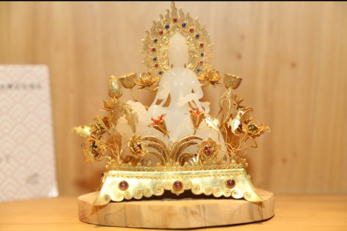 此次文博會(huì),楚釹子品牌展出鳳冠霞帔婚配系列、宅配梅蘭竹菊系列、佛像系列產(chǎn)品等近百余件。其中鳳冠霞帔系列作品,以巧妙的花絲鑲嵌技藝,糅合中國(guó)傳統(tǒng)技藝,融入現(xiàn)代婚紗設(shè)計(jì)理念,打造出流光溢彩、雍容華貴的現(xiàn)代宮廷藝術(shù)之美。