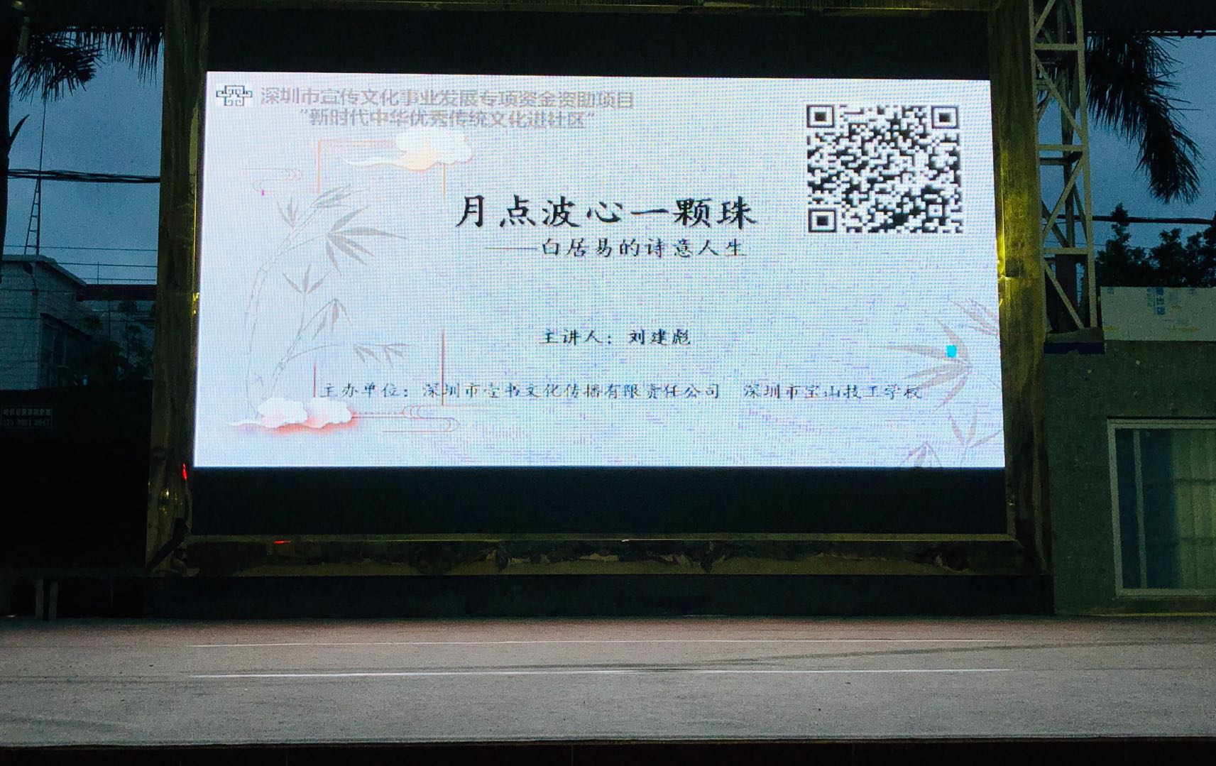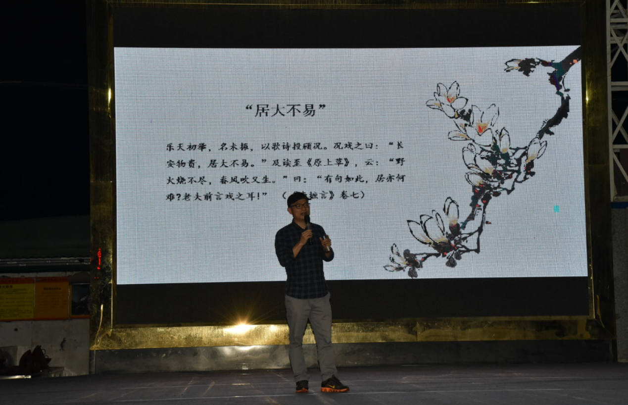 深圳新聞網(wǎng)訊 5月29日晚上,“新時(shí)代中華優(yōu)秀傳統(tǒng)文化進(jìn)社區(qū)”系列活動(dòng)第三場(chǎng)公益文化講座之“月點(diǎn)波心一顆珠——白居易的詩意人生”在深圳市寶山技工學(xué)校寶山大舞臺(tái)拉開帷幕,由愛詩家創(chuàng)始人劉建彪帶領(lǐng)聽眾一同走進(jìn)“詩王”的詩意世界,感悟其至情至性。