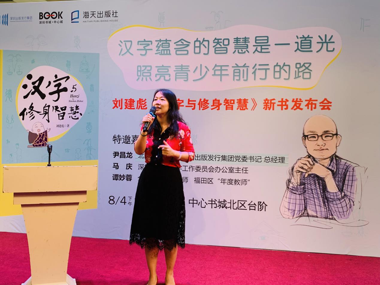 深圳出版發(fā)行集團黨委書記、總經(jīng)理尹昌龍在發(fā)言中指出,漢字里蘊藏著中華文明的密碼,而《漢字與修身智慧》這本書恰是從漢字出發(fā),解讀中華文化的基因,以美德教育為旨歸,有助于喚起我們對漢字的熱愛,對民族文化的自信。他向在場觀眾推薦這本書,并指其信息量大,兼具趣味性、可讀性與啟發(fā)性,值得細細品味。另外,馬慶主任表示,漢字投射的是古人的心靈,古人的智慧,古人的修養(yǎng),他贊嘆《漢字與修身智慧》一書為深圳的文化積累做出了貢獻,并鼓勵親子共讀,共同成長。譚妙蓉老師也力薦此書,認為書中漢字心能量中的小故事深入淺出,富含哲理,對青少年乃至成年人美德教育均有借鑒作用,并聲情并茂地朗誦了書中的《陋室銘》一文,她希望作者將來能創(chuàng)作出更多關于漢字的書,讓更多讀者感受到傳統(tǒng)文化的熏陶與滋養(yǎng)。