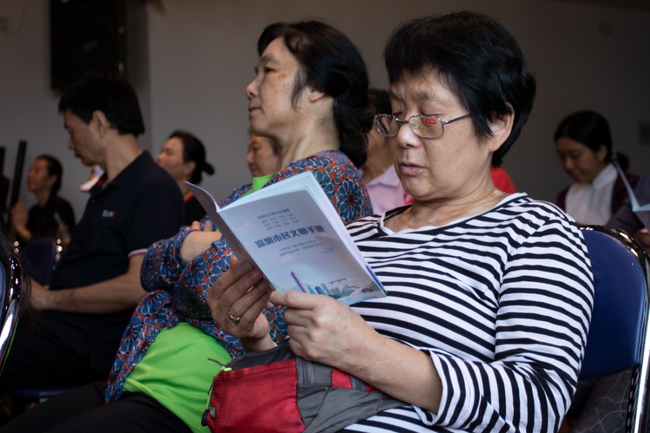 11月13日上午,本系列活動的第六場講座在龍聯(lián)社區(qū)工作站拉開了序幕。講座開始前,現(xiàn)場聽眾每人手上都拿到一本《深圳市民公約》小手冊和《漢字與修身智慧》學習資料,劉建彪老師首先跟大家互動:“我們需要什么樣的家園?文明城市從哪里開始?”“美麗、溫馨、文明、和諧的家園”,臺下一位叔叔的聲音尤其洪亮,劉老師及時肯定了他的回答。劉老師接著說,文明城市從人開始,人是建設文明城市的中堅力量,他進一步補充道,做文明人的第一步是轉(zhuǎn)變思想,只有了解并認同文明的重要性,才會自覺地踐行文明禮儀,積極參與城市文明的創(chuàng)建。