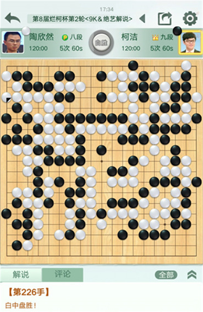 本局陶欣然執(zhí)白后行,以極具觀賞性的大模樣開局,將局面導向他擅長的進攻節(jié)奏。在中腹的作戰(zhàn)中,白方判斷精準,棋感敏銳,保持了很高的AI吻合度,一直良好地把握著局面。行至后半盤,黑方柯潔開始了他擅長的逆風攪局,多處挑起劫爭。好在陶欣然未出大錯,在混亂的局面下穩(wěn)住了局勢,保持優(yōu)勢直至226手黑方投子認負。
