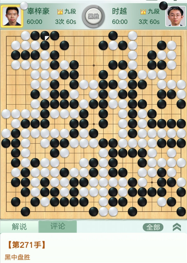 第四臺快棋,是兩位世界冠軍的對決,由深圳隊的時越九段執(zhí)黑快棋對陣江西隊的辜梓豪九段。開局至中盤雙方氣勢如虹,各自棄取,局面依然接近。之后黑棋下方定型失誤,白棋取得領(lǐng)先。在右下的劫爭中白棋判斷出現(xiàn)失誤,使黑棋扳回了局面。進(jìn)入官子階段,黑棋不顧中央隱患搶占右邊官子,白棋如果抓住機會在中央黑空出棋形成劫爭則局面復(fù)雜。實戰(zhàn)白棋沒敢開劫而是繼續(xù)收官,黑棋補棋后穩(wěn)固了勝勢,時越執(zhí)黑中盤勝辜梓豪。