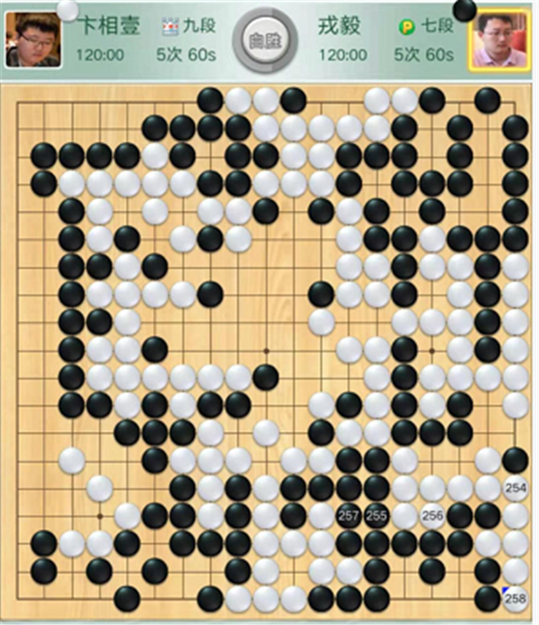第二臺主將臺,由深圳隊戎毅七段執(zhí)黑對陣江西隊外援卞相壹九段。開局黑取實地白取外勢,局面接近。中盤黑棋在中央放棄出頭花兩手棋吃掉左下角白棋稍小,白棋棄角后圍住中央巨空,白稍好。官子階段白棋左上形狀處理有誤,黑棋未能抓住沖擊機會,選擇大幅退讓,最終目數(shù)不夠。戎毅執(zhí)黑負(fù)卞相壹。