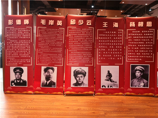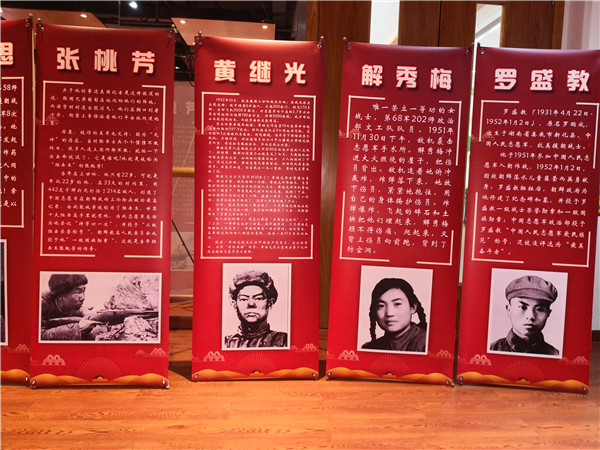 《抗美援朝十大英雄和著名戰(zhàn)役宣傳展》主要以展板形式陳列在活動現(xiàn)場四周,以便于到場的人學(xué)習(xí)參觀。據(jù)悉,在抗美援朝戰(zhàn)爭中,中國人民志愿軍榮立三等功以上指戰(zhàn)員有302724名,被授予英雄、模范稱號和特等功人員502名,其中:特級英雄兩名,一級英雄50名,一級模范4名,二級英雄286名,二級模范75名,特等功85名。本次宣傳展收集了十位最有影響的英雄,他們是:彭德懷、楊根思、黃繼光、解秀梅、孫占元、邱少云、楊育才、張?zhí)曳?、王海、羅盛教。著名戰(zhàn)役有:上甘嶺戰(zhàn)役、馬良山爭奪戰(zhàn)、橫城反擊戰(zhàn)、云山之戰(zhàn)……參觀之后,許多人為英雄人物的言行所感動,表示要傳承發(fā)揚(yáng)抗美援朝不畏強(qiáng)權(quán)的英雄主義和革命精神。