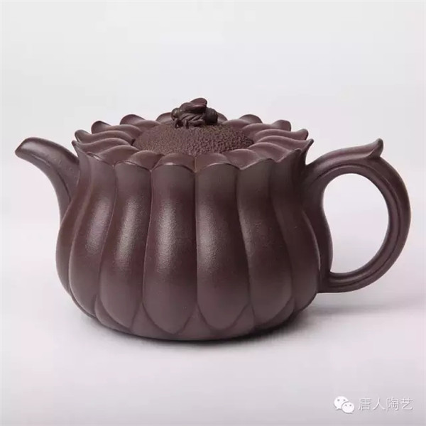 第一件,《蜂菊壺》取材于大自然蜜蜂采蜜之情形,立意新穎。壺身等分成十六瓣,俯視如盛開的菊花,蓋為花蕊,壺鈕設(shè)計(jì)成正在花蕊上采蜜的蜜蜂。顯得靜中有動(dòng),生機(jī)盎然,側(cè)視該壺,筋囊飽滿凝重,通體線條流暢,大氣中不乏精巧。菊花與蜜蜂肖形逼真,洋溢著大自然的和諧情趣。據(jù)說,唐朝霞老師為制作此壺,多次徘徊在桃花林里、菊花叢中,觀察蜜蜂的神態(tài),巧妙地讓蜜蜂造型躍然“蜂菊壺”壺鈕上,靜中寓動(dòng),令人叫絕。