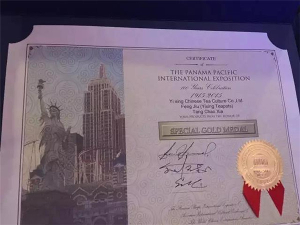 據(jù)悉,此次在美國(guó)舉行的巴拿馬太平洋萬(wàn)國(guó)博覽會(huì)百年慶大會(huì)上,共有來自全球30多個(gè)國(guó)家5000個(gè)品種參展,盛況空前,共評(píng)出3個(gè)特等獎(jiǎng)、10個(gè)金獎(jiǎng)以及銀獎(jiǎng)、銅獎(jiǎng)、優(yōu)秀獎(jiǎng)若干。唐朝霞的作品能夠獲得兩項(xiàng)大獎(jiǎng),無疑是宜興紫砂的杰出代表。百年之前的1915年,宜興紫砂在首屆巴拿馬太平洋萬(wàn)國(guó)博覽會(huì)上也曾讓世界為之傾倒,程壽珍的“掇球壺”、范大生的“大柿子壺”獲頭等獎(jiǎng)。1933年,在美國(guó)芝加哥萬(wàn)國(guó)博覽會(huì)上,宜興紫砂再次轟動(dòng)世界,范大生的“合棱壺”、俞國(guó)良的“四方傳爐壺”、汪寶根的“東坡壺”、朱可心的“竹節(jié)鼎”喜獲金獎(jiǎng)。國(guó)人眾所周知,茅臺(tái)酒是榮獲巴拿馬萬(wàn)國(guó)博覽會(huì)金獎(jiǎng)一舉成名的,而今,宜興唐朝霞的《蜂菊》壺獲得本次活動(dòng)的特別金獎(jiǎng)、《丹鳳朝陽(yáng)》壺獲得金獎(jiǎng),喻示著:唐朝霞的作品不僅走出了宜興、走到深圳,還走出了國(guó)門、走向了全世界!