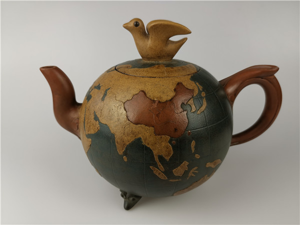 再說第二件,《世界和平壺》的回歸。2020年6月,唐朝霞老師的愛人韋強(qiáng)先生正在深圳商會(huì)開會(huì)。其間,一次會(huì)議結(jié)束后剛回到酒店時(shí)手機(jī)響起!一位美國(guó)的朋友電話給他告訴他一個(gè)天大的喜訊:在日本發(fā)現(xiàn)了唐朝霞爺爺唐鳳芝的傳奇作品“世界和平壺”。韋強(qiáng)介紹說,1943年,因?yàn)樘气P芝是民國(guó)時(shí)的紫砂大師,民國(guó)政府委托唐鳳芝先生特制了“世界和平壺”,隨后,由宋美齡女士在赴美國(guó)演講時(shí)一起帶了過去,象征著世界和平之意!想不到時(shí)隔80年,竟然在日本出現(xiàn)了。韋強(qiáng)說,看到實(shí)物照片時(shí),真的太激動(dòng)了!此前,他們?cè)诩依镏豢吹竭^爺爺設(shè)計(jì)的圖紙,從沒看到過實(shí)物,接到這意外訊息真的是驚喜萬(wàn)分!真是難以入眠!通過一系列的協(xié)調(diào),日本的藏家愿意轉(zhuǎn)讓,讓激動(dòng)的心更加興奮了,立即訂了機(jī)票,著手辦理“回歸事宜”。當(dāng)他終于在海關(guān)拿到了這件作品,包裝非常完好,便緊緊的抱在胸前:飄泊海外80年的“思念”終于落定了,爺爺唐鳳芝的“世界和平壺”終于回家了。韋強(qiáng)說:當(dāng)時(shí)的心情無法用言語(yǔ)形容!只覺得天空格外清新、陽(yáng)光格外燦爛!