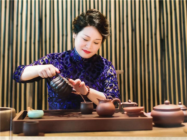 唐朝霞老師用獲獎(jiǎng)的蜂菊壺泡茶。