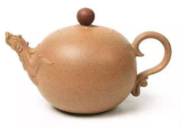 第三件,《丹鳳朝陽(yáng)壺》以鳳首為壺流,祥云做壺把,鳳凰昂首鳴唱,振羽欲飛,其線條婉轉(zhuǎn),儀態(tài)優(yōu)美,肖形傳神,壺身圓潤(rùn)飽滿。泥料精心選配梨皮砂,色澤金黃,質(zhì)感豐富,壺鈕泥色變化為朱色,仿佛一輪朝陽(yáng)在金色的云霞中一躍而出,帶出一片光明。此壺寓意丹鳳呈祥,有完美、吉祥、和諧之涵意。