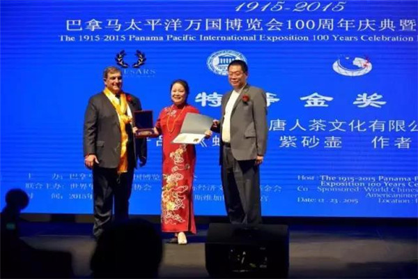 2015年底,巴拿馬太平洋萬(wàn)國(guó)博覽會(huì)在美國(guó)拉斯維加斯舉行,唐朝霞選送參展的“蜂菊壺”榮獲特別金獎(jiǎng),她也因此成為新中國(guó)成立以來唯一獲此國(guó)際大獎(jiǎng)的女性紫砂藝術(shù)家。
