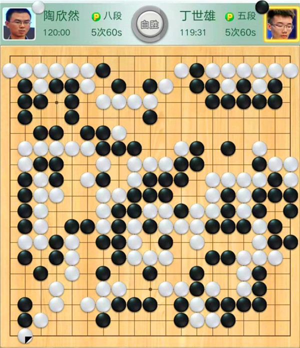 最后一局隨即揭曉:陶欣然“錦上添花”,執(zhí)白完勝丁世雄。布局時,白棋左邊與右上獲利。黑棋進攻右邊白棋時候,白棋漂亮棄子搶占左下大棋優(yōu)勢擴大。之后白棋穩(wěn)扎穩(wěn)打直至終局獲勝。