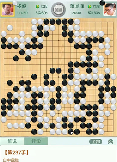 時越快棋執(zhí)白對陣張濤。右邊作戰(zhàn)時候,黑棋沒有選擇造劫劫爭而是退讓,被白將右邊幾子吃掉后又吃掉右上黑棋,黑棋局面落后。之后黑棋右下又死活看錯被白先手活出,導(dǎo)致雪上加霜,實(shí)際上棋局已經(jīng)結(jié)束。