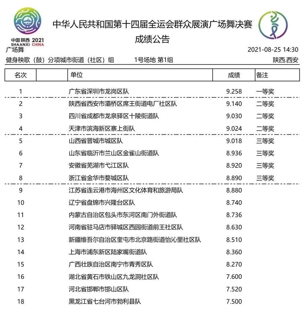 8月29日,第十四屆全國運動會群眾展演廣場舞健身秧歌(鼓)項目公布競賽結(jié)果,由深圳市文化廣電旅游體育局和深圳市廣場舞協(xié)會組織代表廣東省參賽的隊伍,以一套整齊劃一、剛?cè)岵淖赃x套路《我的祖國》戰(zhàn)勝了多個省市的傳統(tǒng)秧歌強隊,得到最高名次,獲得了含金量十足的城市街道(社區(qū))組一等獎。