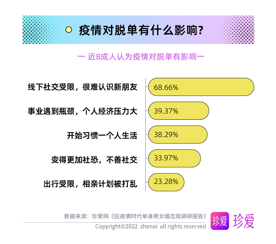 多數(shù)人都更渴望愛情,但疫情也對脫單進(jìn)程產(chǎn)生了一定影響。報(bào)告顯示,近八成人認(rèn)為疫情對脫單有影響,其中首要影響為線下社交減少導(dǎo)致很難認(rèn)識新朋友(68.66%),其次為日常出行受限因此相親計(jì)劃被打亂(39.37%),此外還有開始習(xí)慣一個(gè)人生活、事業(yè)遇到瓶頸導(dǎo)致的個(gè)人經(jīng)濟(jì)壓力大、更加“社恐”等影響。