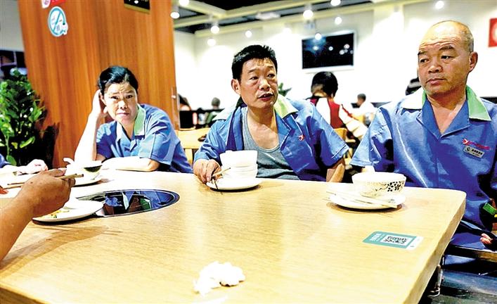 在店里吃飯的人群里,有一張臺(tái)全是清一色的藍(lán)色工作服,特別顯眼。“我們每天都會(huì)來(lái)這里吃早餐,差不多有一年時(shí)間了,這里的老板太好了,希望他能一直開(kāi)下去?!边@幾個(gè)大叔、大嬸是周邊物業(yè)的清潔工人,他們每天早上5點(diǎn)鐘就上崗工作,忙完就到了6-7點(diǎn),又餓又累,有一碗熱騰騰的早餐是一件非常幸福的事,而這種開(kāi)心快樂(lè)的事情在這里發(fā)生了。吳姓清潔工說(shuō),這里的老板和員工很好,大家來(lái)這里吃粥,沒(méi)有感到半點(diǎn)不自在,就像在自己家一樣。